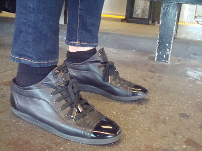 The shoe's are supreme. This was my favorite part of her outfit. The all black color way for these Chanel sneakers usually go un-noticed but they caught my attention. Women usually get them in black and white causing them to look like a rendition to 1950 black and white wingtip shoes.